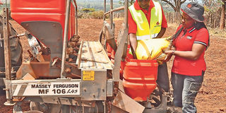 FMD's Lucy Mukuru shows farmer, Moses Kiptanui, how to input seeds in a planter in a farm in Cherangany. The right plant population per acre ensures that while competing for nutrients and sunlight, the plants offer each other healthy support for maximum yields. PHOTO | POOL