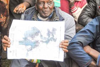 A resident of Kapsinendet in Marioshoni, Nakuru County, displays the map showing where the forest land sits on July 12. PHOTO | JOHN NJOROGE | NATION MEDIA GROUP