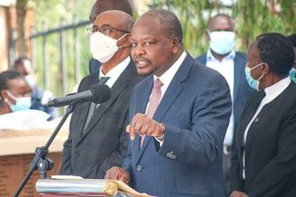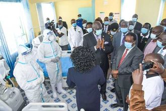 Education CS George Magoha (centre) and Governor Alex Togos (right) during the opening of Tambach Sub-County Hospital Covid-19 isolation centre in Elgeyo-Marakwet on July 10, 2020. PHOTO | FILE | NATION MEDIA GROUP